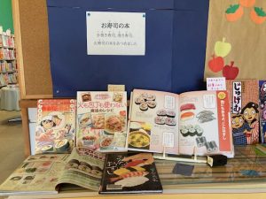 また、学校の図書室の入り口の前には、お寿司の本を集めたコーナーも今回の出前授業に併せて設置していただきました。
